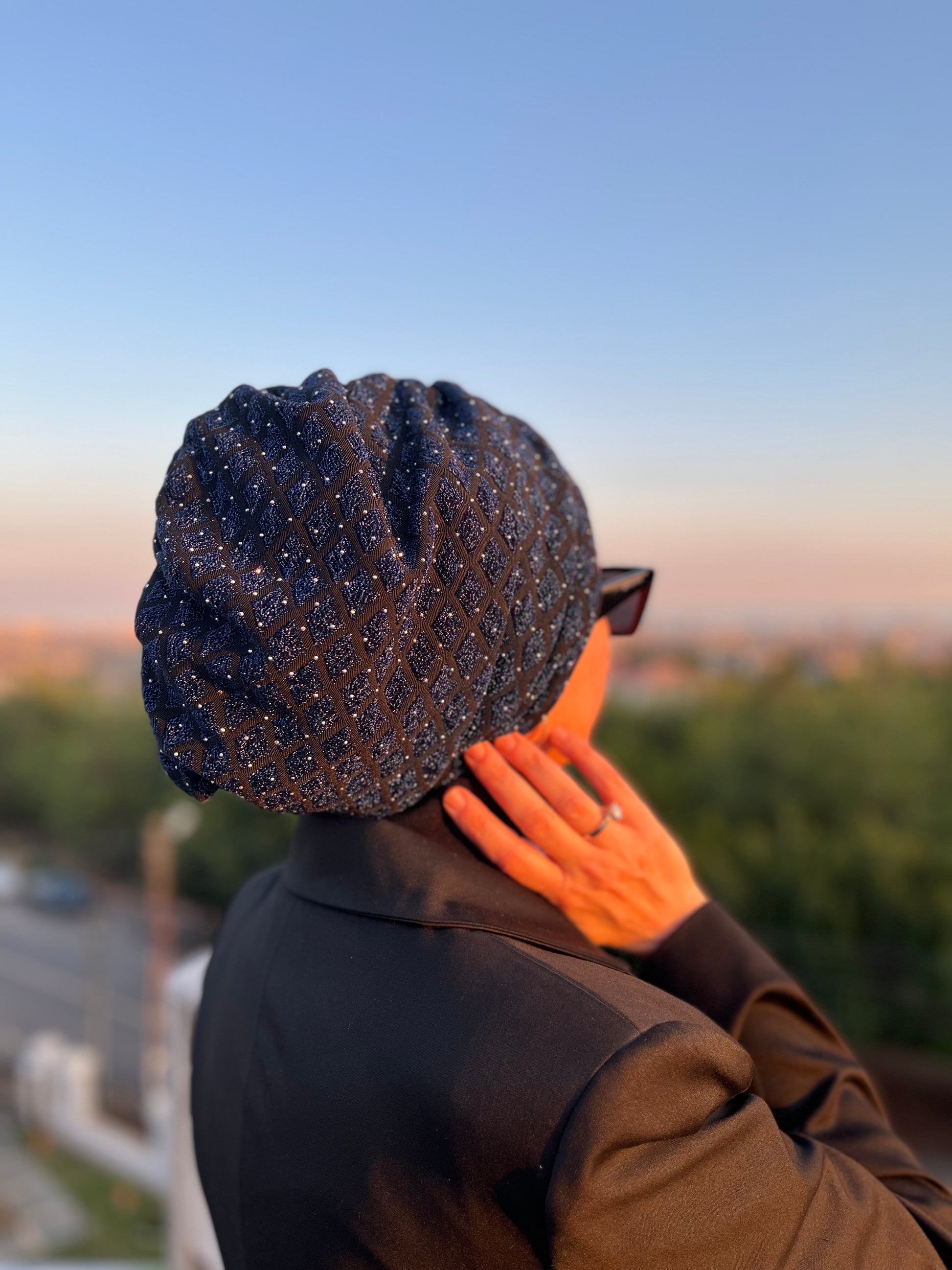 LACİVERT TAŞLI JAKARLI BÜZGÜLÜ BONE